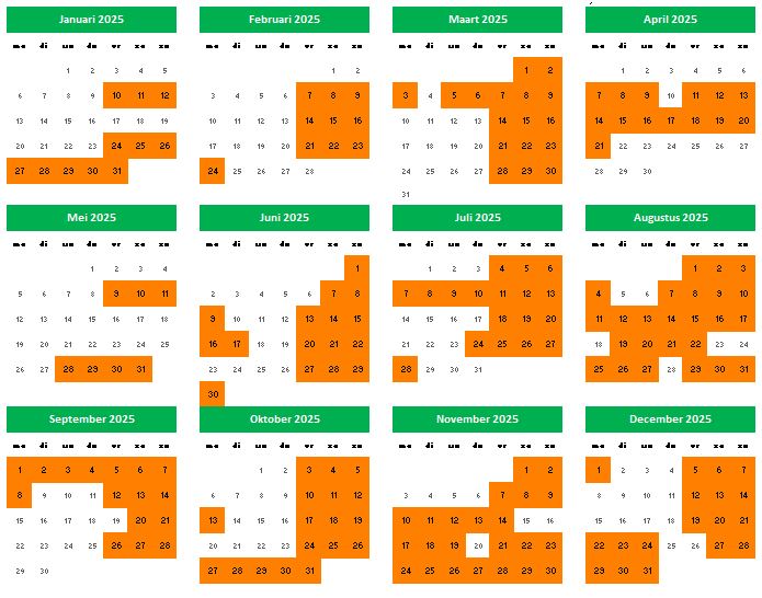 U kan in volgend kalenderoverzicht van 2025 onmiddellijk nagaan of een bepaalde periode nog beschikbaar is.